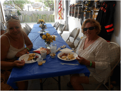 The kitchen was full of chefs on pancakes and meats: Tommy, Joe C, Gary Leone, Kevin Butler, Rose Liotta, Sharon Sitone, Drs Linda and Janet.  The regular food servers were on duty again this year: Fran Stobnitsky and Linda Barkan. Roz Sackoff once again doled out the fruit with care and made sure the maple syrup pitchers were always full. (The pure Vermont maple syrup was donated by Sugarmans - the owner is a friend of Kevin & Ginny Butler) Right by her side, Joanne Agoglia monitored OJ, milk and ice water while sprinkling powdered suger on folks' pancakes and fruit (a classy touch). Ginny filled in wherever needed. At the door were Rita Goldman and Lauren taking money and giving out wrist bands while Patti Romanzi ran the "Deck of Cards" 50/50 - a fun new idea she came up with. It was won by Geneva Kelly from Dunewood ($260 on each end). Greeting our guests and explaining the "lay of the land" were Michelle Schlecter and Phyllis Bakalar. An added touch was all of the "staff" wearing this year's KFD t-shirts given as a thank you gift by Chief Dominic and the dept.